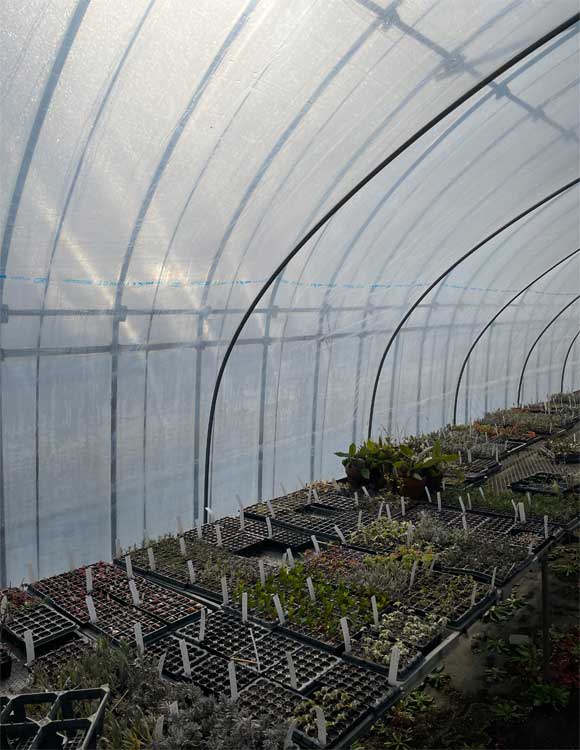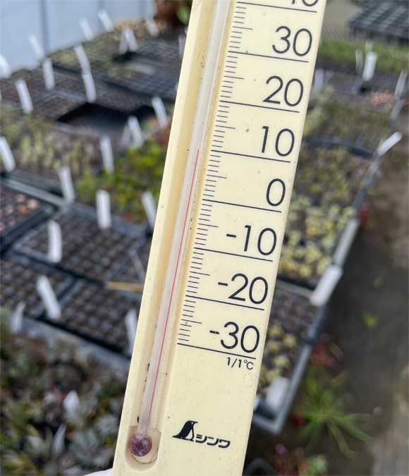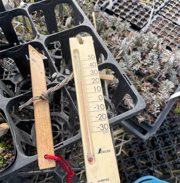 当店のビニールハウスは多くは開け放っていて日中も夜間もほぼ外気温とイコールだ。ただ、レモングラスなど一部の寒さに弱い種類を冬の間防寒するためのビニールハウスは別。外の気温がマイナス5度以下になってもなんとか苗が越せるよう、一応二重張りだ。