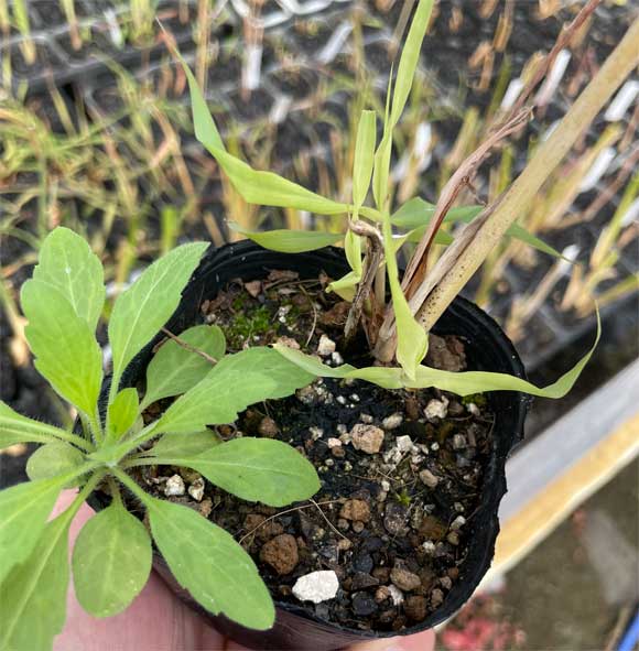 一時的に気温が上がっても寒さに弱い苗は枯れないだけで成長もしない。ところが寒さに強い雑草たちは大喜びで伸びていく。すこし油断しているとあっという間にポットが雑草だらけだ。
