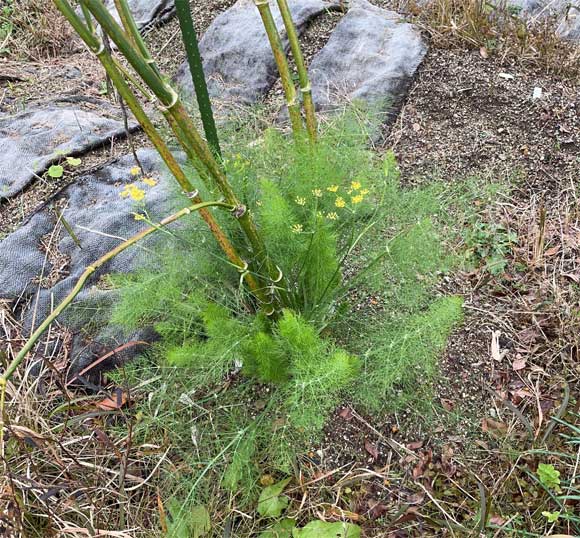 フェンネルの地植え株の株元からは春のように勢いがよく新芽が伸びている。まあそれは秋でも珍しくはないとしても、花さえぽつりぽつり。これから開花しようとしているのか・・・。米の二期作(再生二期作)も話題になっているぐらいだから、フェンネルも年中花が咲く気候になってしまいそうだ。十年に一度ではなく毎年のように。