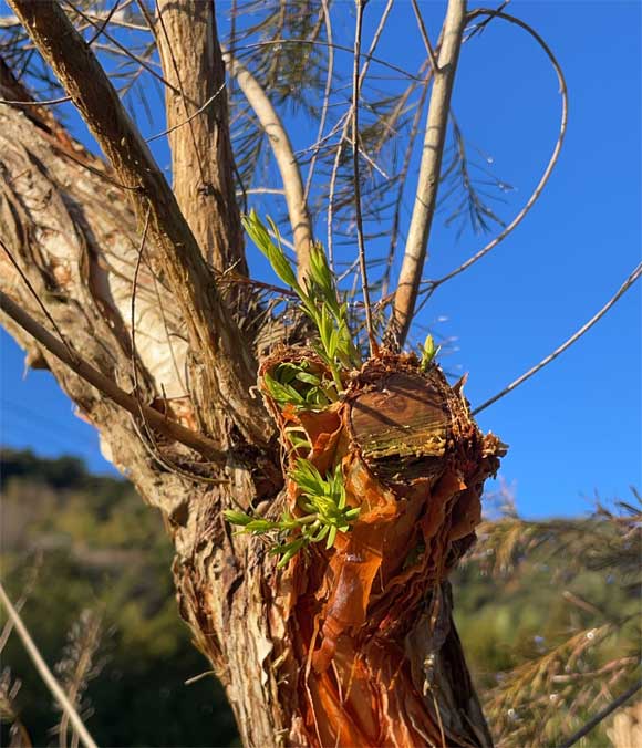 秋の終わり頃、暇をしていた家族に伸びすぎたティートゥリーの剪定作業を頼んだ。地植えの株だが背が届く程度の高さのものだし、十年以上たつ充実した株なので適当に剪定してもまたしっかり芽を伸ばしてくれるはずだという確信があるから頼めたのだが、実際に作業をしてもらったら、「どうしてこんなところで・・・」という場所で剪定されていてある意味感心してしまった。素人にお願いしたのはこちらなので文句を言う気はないが。