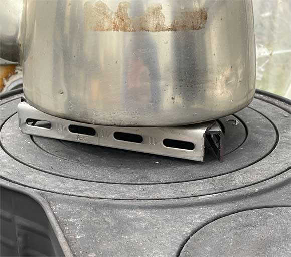 ところが薪ストーブは相当火力も強いので(それぐらいしないとここは温まらないし)、お湯もすぐに沸くが、油断しているとすぐに空焚きになってしまう。こまめに水を足せば解決するが、ここには水道がなく、家から持ってくる水は貴重品。沸いたやかんをストーブの上で少し浮かせておくゴトクのようなものがずっと欲しかったのだ。